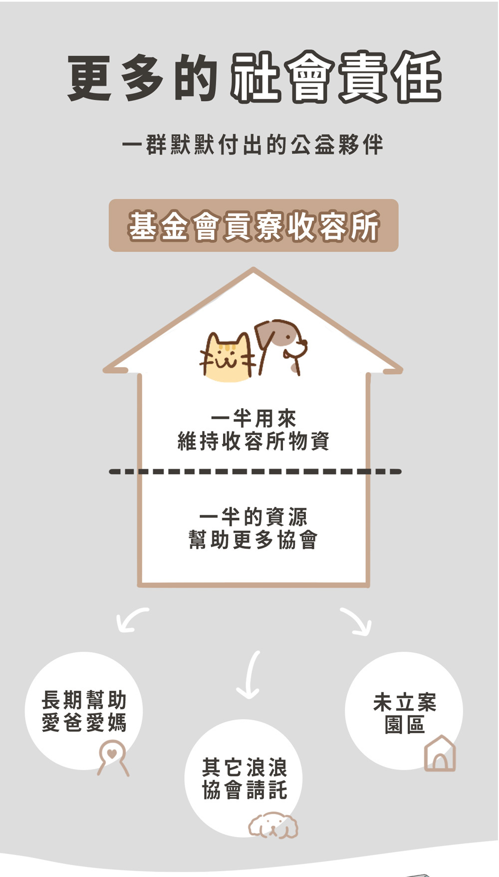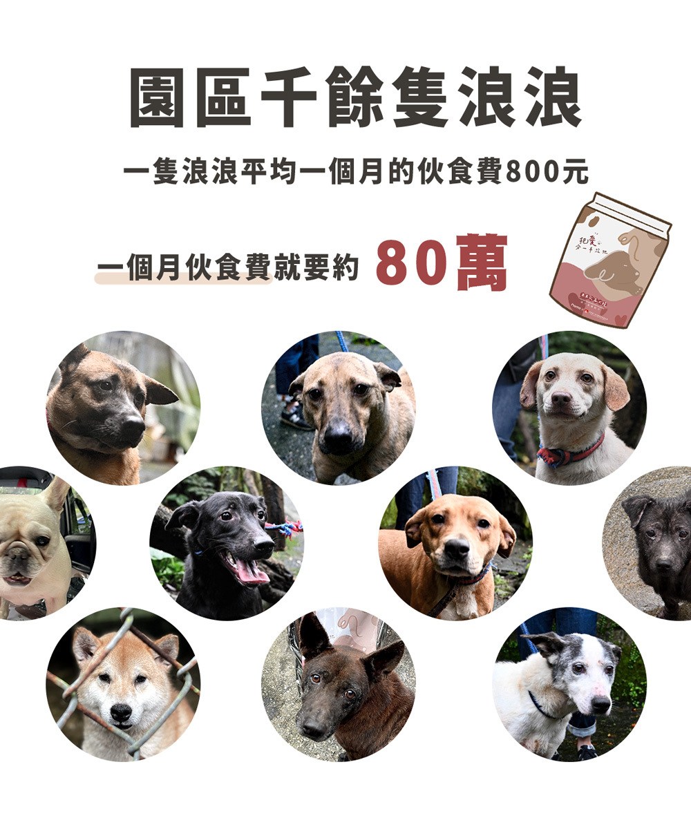 當您購買此商品,會在每月15號將所有愛心犬糧集中捐贈至【財團法人流浪動物之家基金會】再由基金會配送至缺糧園區
