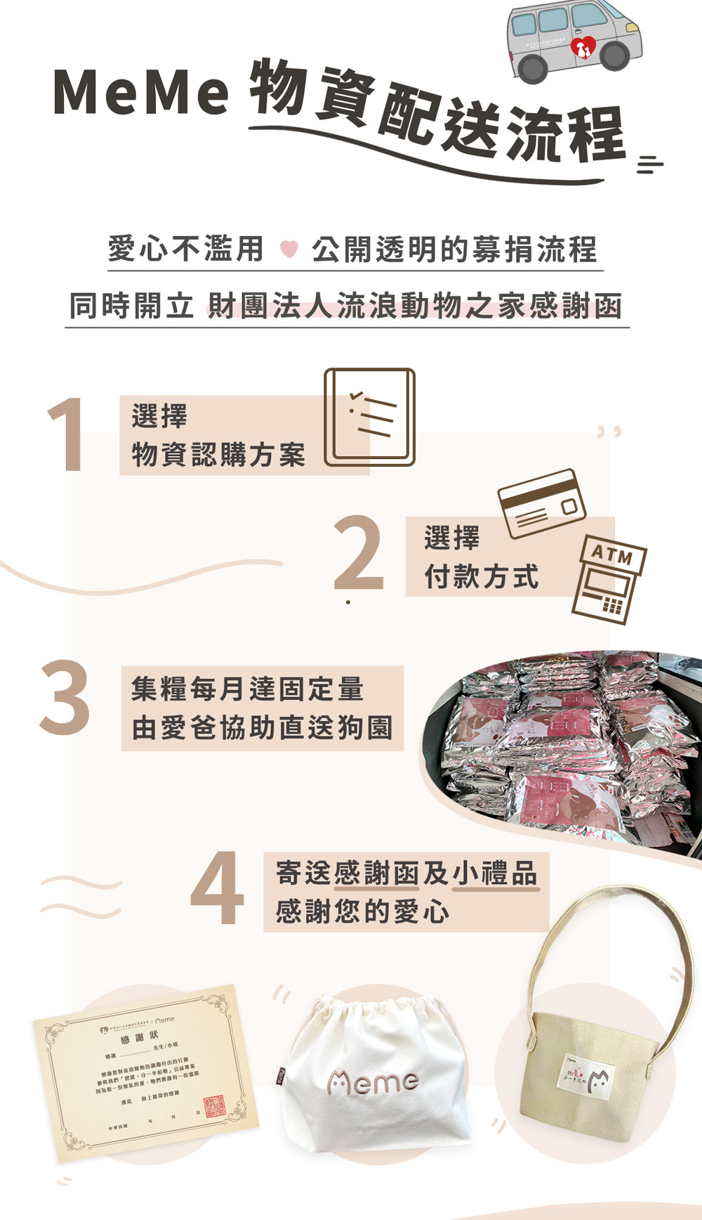 本公益活動不接受捐款形式,我們換成實質的犬糧幫助